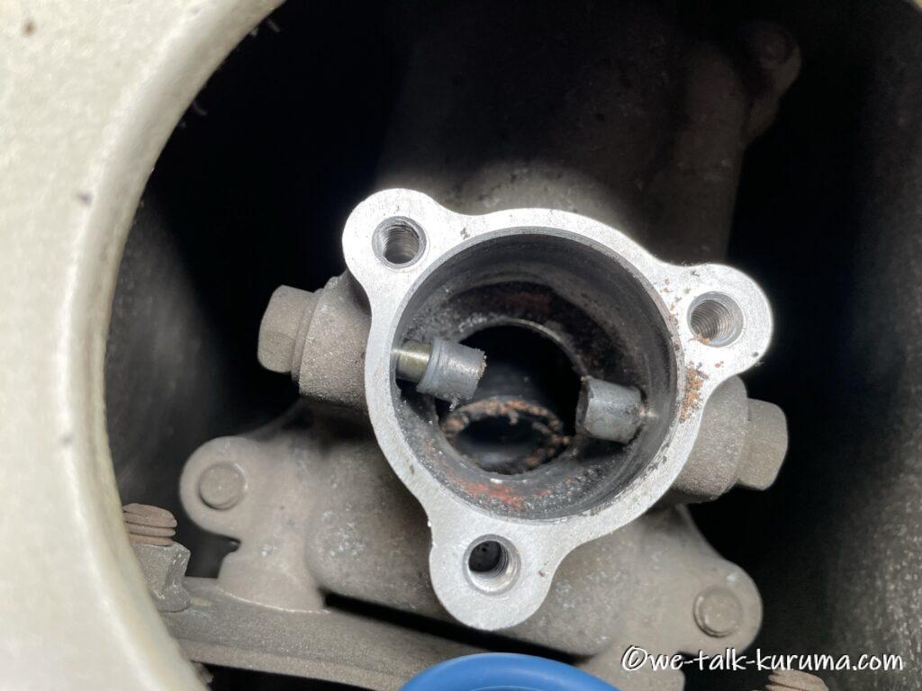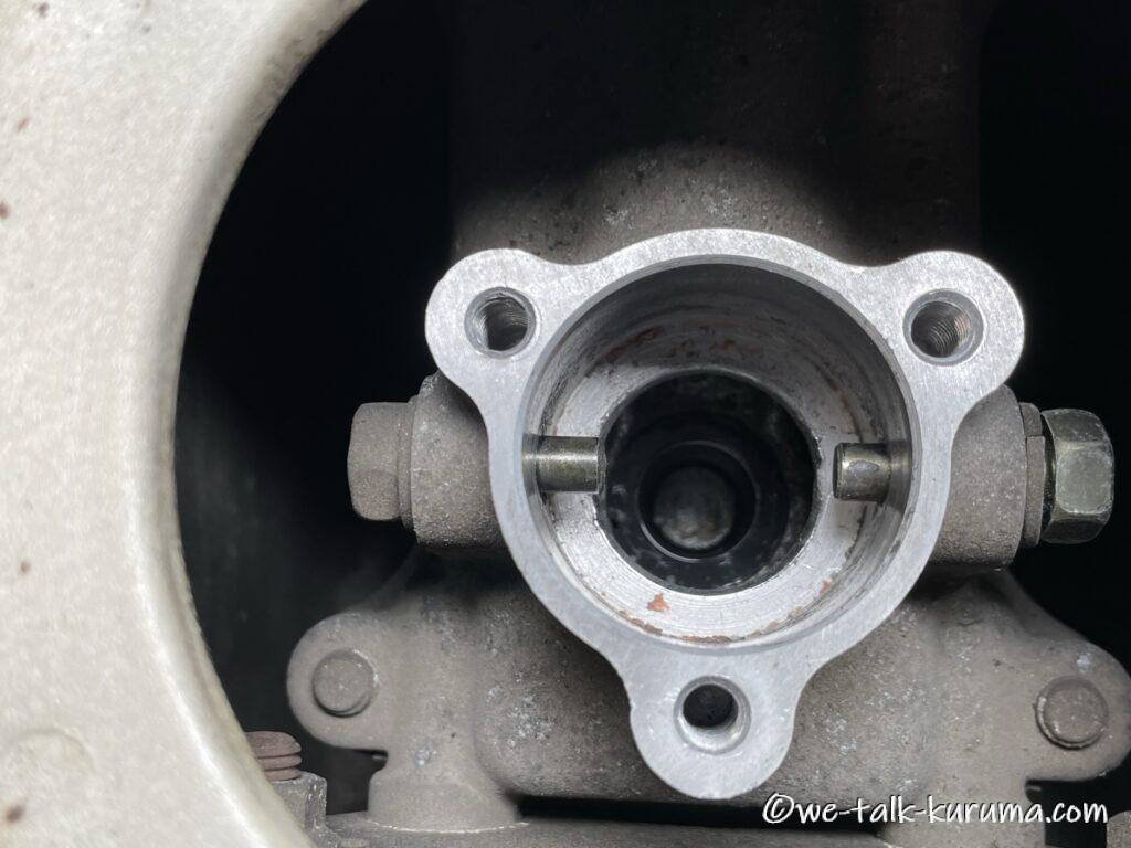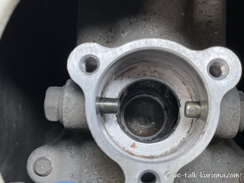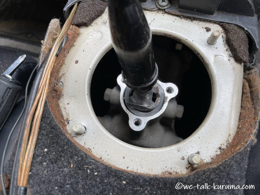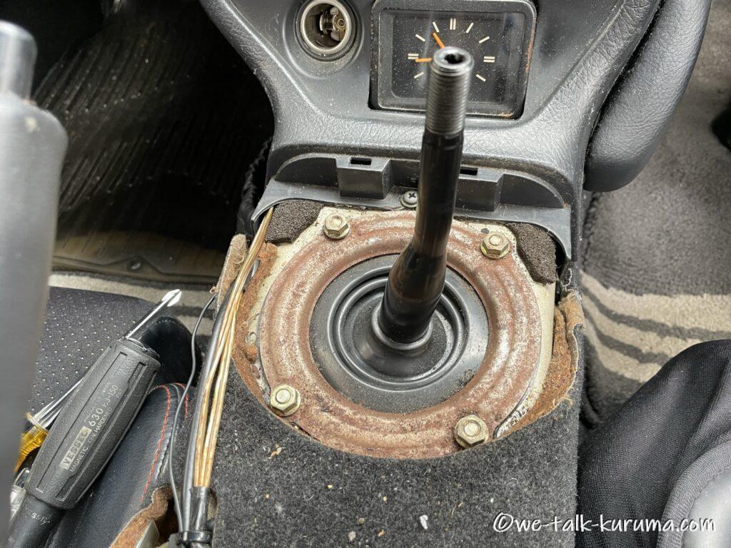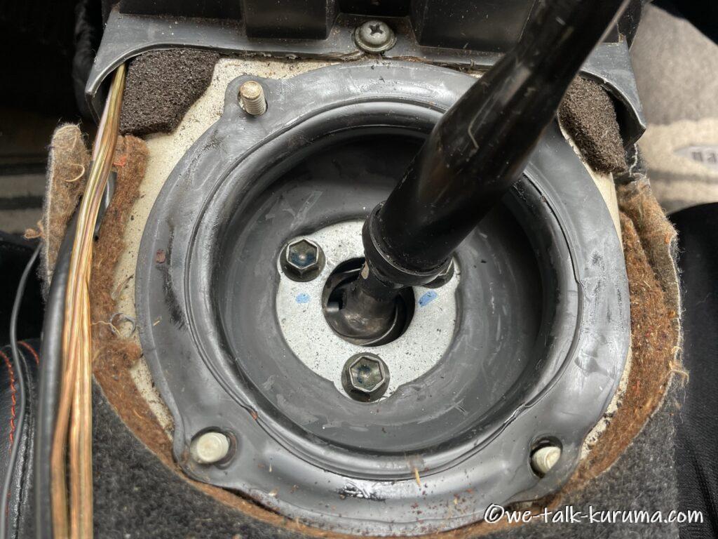 どうやら、30年弱の間に粉になってしまったようです。上の「シフトレバーを抜いた」写真の穴の周りに、汚れみたいなものがついていますが、これがそのパーツの成れの果てのようです。