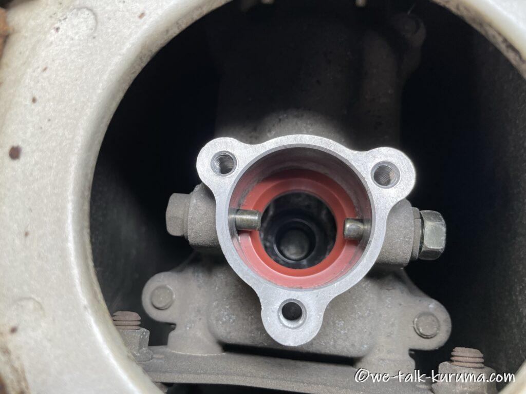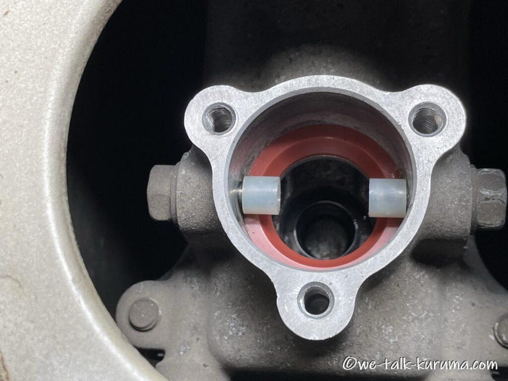 本来なら、えんじ色をしたスペーサーが入っているはずですが、見つからない。ネットで他の方の作業を見ても、劣化した部品がありますが…