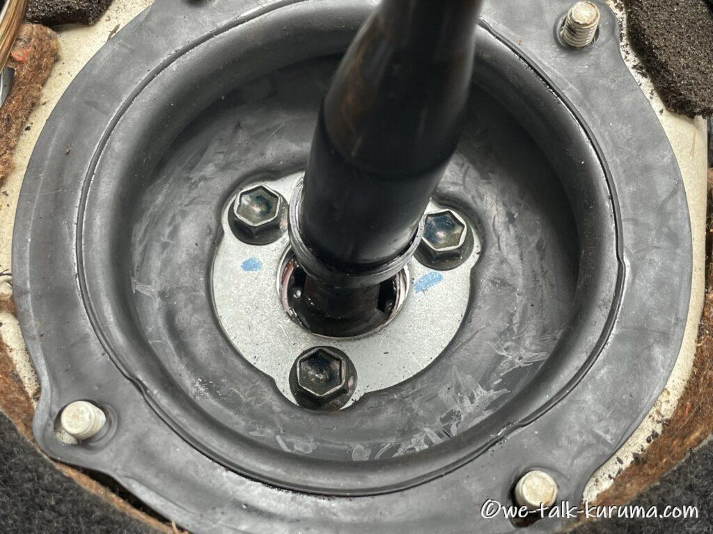 画像で見える白いパーツ二つ(横のブッシュ)と、奥に見える黒い部品(底のブッシュ)は交換しますので取り外します。